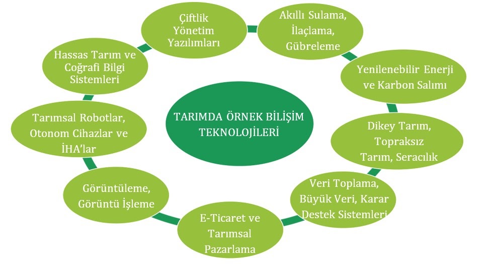 Büyük veri analizi, Nesnelerin İnterneti (IoT) ve Yapay Zeka ve dijital uygulama teknolojileri kullanılarak tasarlanan GPS tabanlı konumlandırma sistemleri, toprak ve bitki sensörleri, İHA’lar, uydu görüntüleme sistemleri, otomatik sulama sistemleri, otonom cihazlar, vb